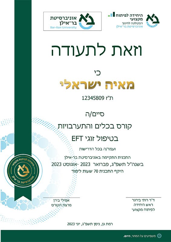 בשיטת EFT מטעם ICEEFT הארגון העולמי בארה"ב. מלווה הכשרות