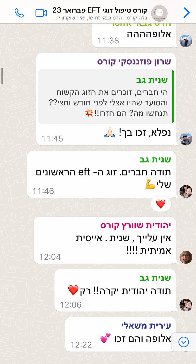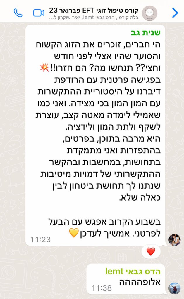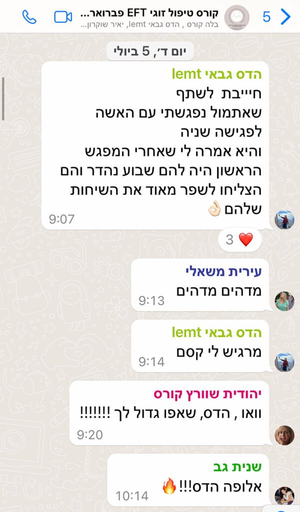 הגעתי לקורס כי רציתי לרכוש עוד כלים וידע למקרים שבהם זוגות מגיעים מאד טעונים. חיפשתי משהו שיגע באמת בנקודה ואז הגעתי לקורס. במהלך הקורס נפתח לי עולם. אמילי היתה כל כך נוכחת שם והיא הצליחה לעזור לי להטמיע את הכלים של ה EFT בתוך התהליכים שלי בקליניקה וגם בתוך החיים האישיים שלי בתוך הזוגיות עצמה. היא יודעת לדבר על זה בצורה פשוטה, מדוייקת וחדה ברמה שאתה אומר וואלה זה ככה זה עובד. ואז כשהגעתי לקליניקה זה גרם לטרנספורמציה. קודם כל בשבילי כי אני לא נבהל מזוג שהגיע אלי סוער.