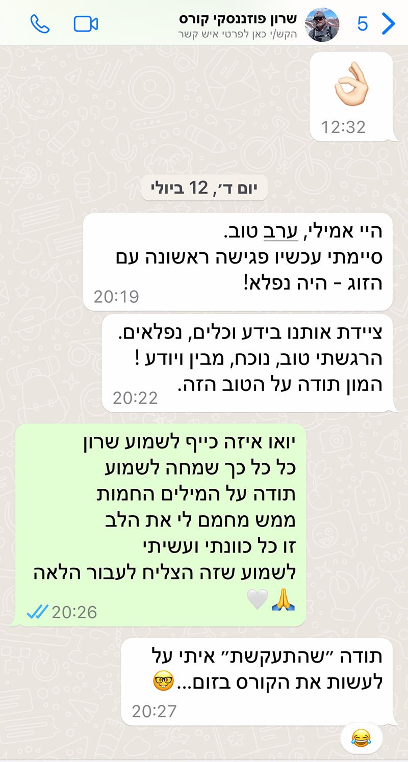 "אני לא אגזים אם אני אומר שזה הקורס מחולל המהפך והמדהים ביותר שאני עברתי. אמילי היא המרצה הטובה ביותר איתה למדתי אי פעם בחיי."